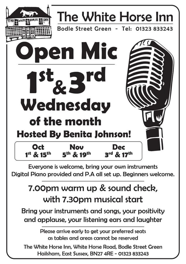 We should mention that the White Horse is also the venue for a regular Open Mic night, thanks to tireless local music promoter and organiser Benita Johnson. The next open mic night will be Wednesday November 5th.