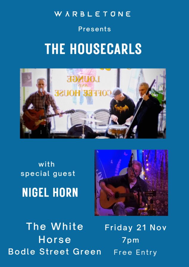 The Housecarls‘ appearance at The White Horse Bodle Street Green (7pm Friday 21st November) marks something of a homecoming for band member Danny Goring who organised the gig. Danny grew up in Rushlake Green (pictures anyone?) and in the 90s also lived in Warbleton, where he was involved in community music making. Now living in Hastings, Danny has begun putting on music events under the ‘WARBLETONE’ banner, which is a collective venture with a group of other musicians (some Warbletonians).