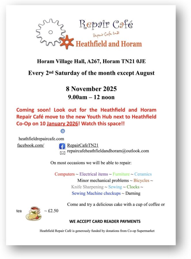 And next month the Heathfield and Horam Repair Café moves to the new Youth Hub next to Heathfield Co-Op on 10 January 2026! Watch this space for news: https://www.facebook.com/RepairCafeTN21